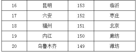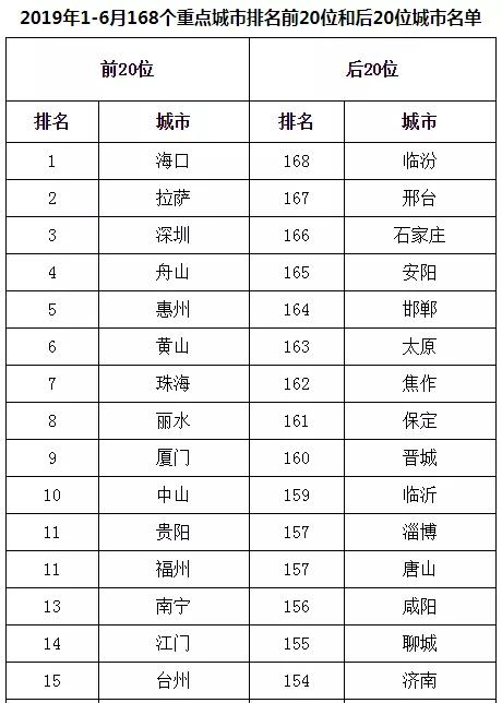 2019年1-6月,168個重點城市中臨汾、邢臺、石家莊市等20個城市空氣質量相對較差(從第168名到第149名);???、拉薩、深圳市等20個城市空氣質量相對較好(從第1名到第20名,見附表2)。
